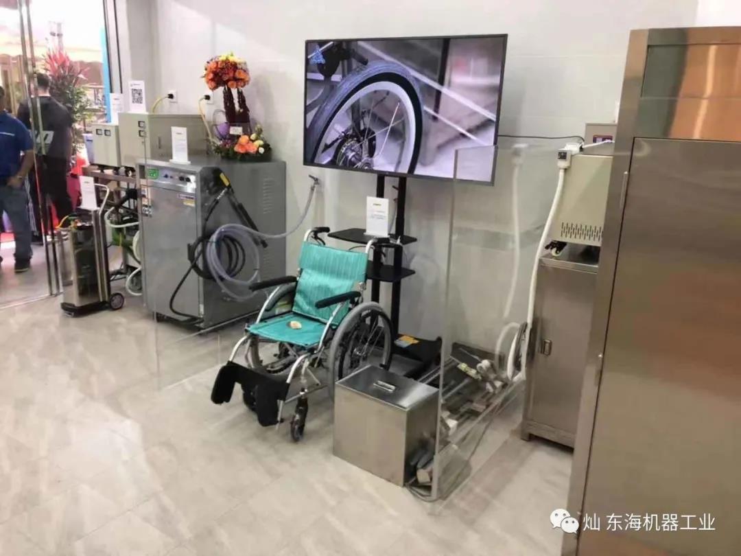 先使用高压高温水来清洁轮椅上的脏污,再使用臭氧水来进行消毒杀菌和脱臭
